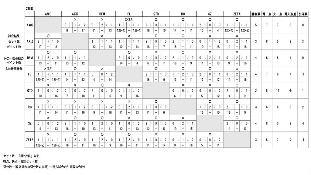 セット数…「勝:分:負」表記 (+○)…延長戦のポイント数 TA=時間勝負